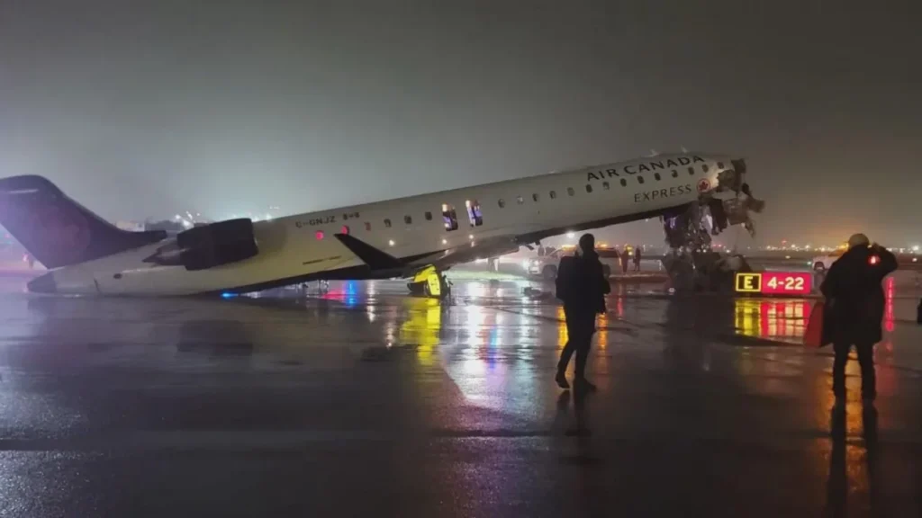 De acuerdo con las autoridades, el accidente se registró aproximadamente a las 23:40 horas locales, cuando la aeronave tipo Bombardier CRJ-900, que realizaba el vuelo AC8646 procedente de Montreal, impactó contra el vehículo de rescate mientras aterrizaba. La colisión aplastó el morro del avión y dejó al aparato inclinado hacia arriba, con graves daños visibles en la cabina de mando y escombros dispersos en la pista.